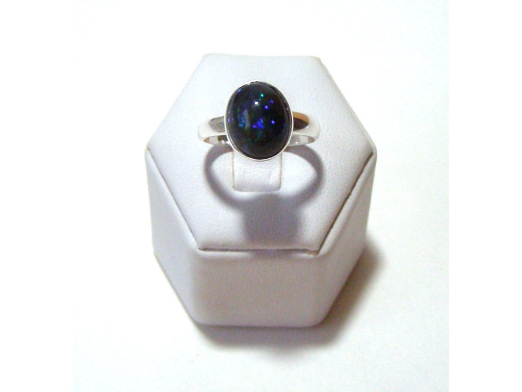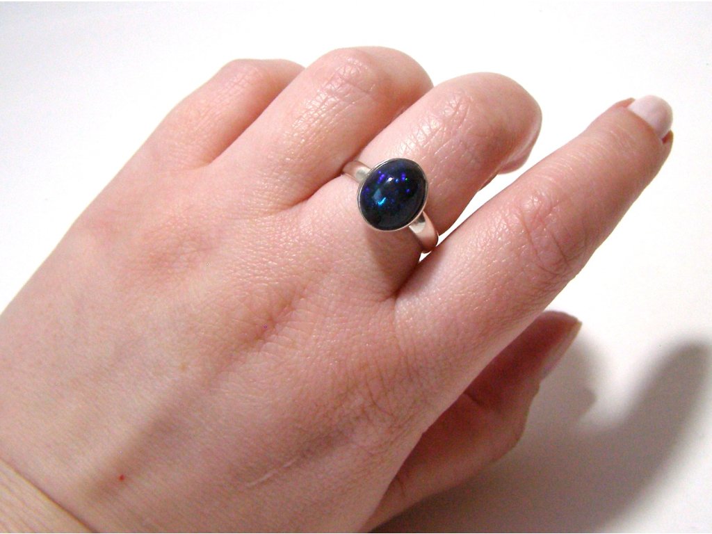 Černý etiopský opál patří mezi opály s tmavým základem, na kterém vynikne barevný záblesk. U tohoto kusu se hra barev nese v klidnější, „noční“ náladě – třpyt se ukáže ve správném světle a prsten pak působí živě, pokaždé trochu jinak.