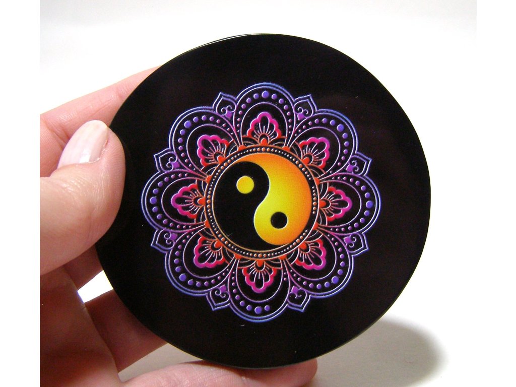 Leštěná destička z černého obsidiánu s barevným mystickým symbolem. Jedná se o přírodní kámen a ruční práci, jednotlivé kusy se mohou lehce lišit.