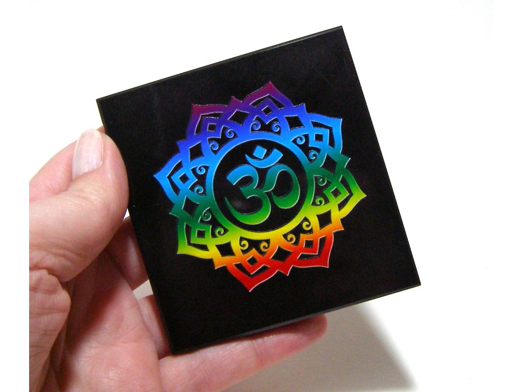 Leštěná destička z černého obsidiánu s barevným mystickým symbolem. Jedná se o přírodní kámen a ruční práci, jednotlivé kusy se mohou lehce lišit.