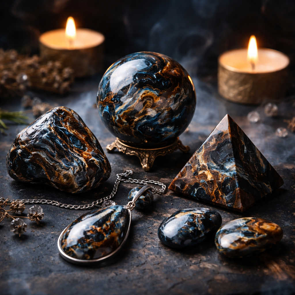 Pietersit je kámen, který v sobě nese pohyb. Ne klidnou hladinu, ale vír, který umí rozfoukat staré nánosy a ukázat, co je skutečně podstatné. Jeho temná hloubka s modrými a zlatými záblesky často působí jako obloha těsně před bouřkou – chvíle, kdy se něco láme, čistí a přeskupuje.
