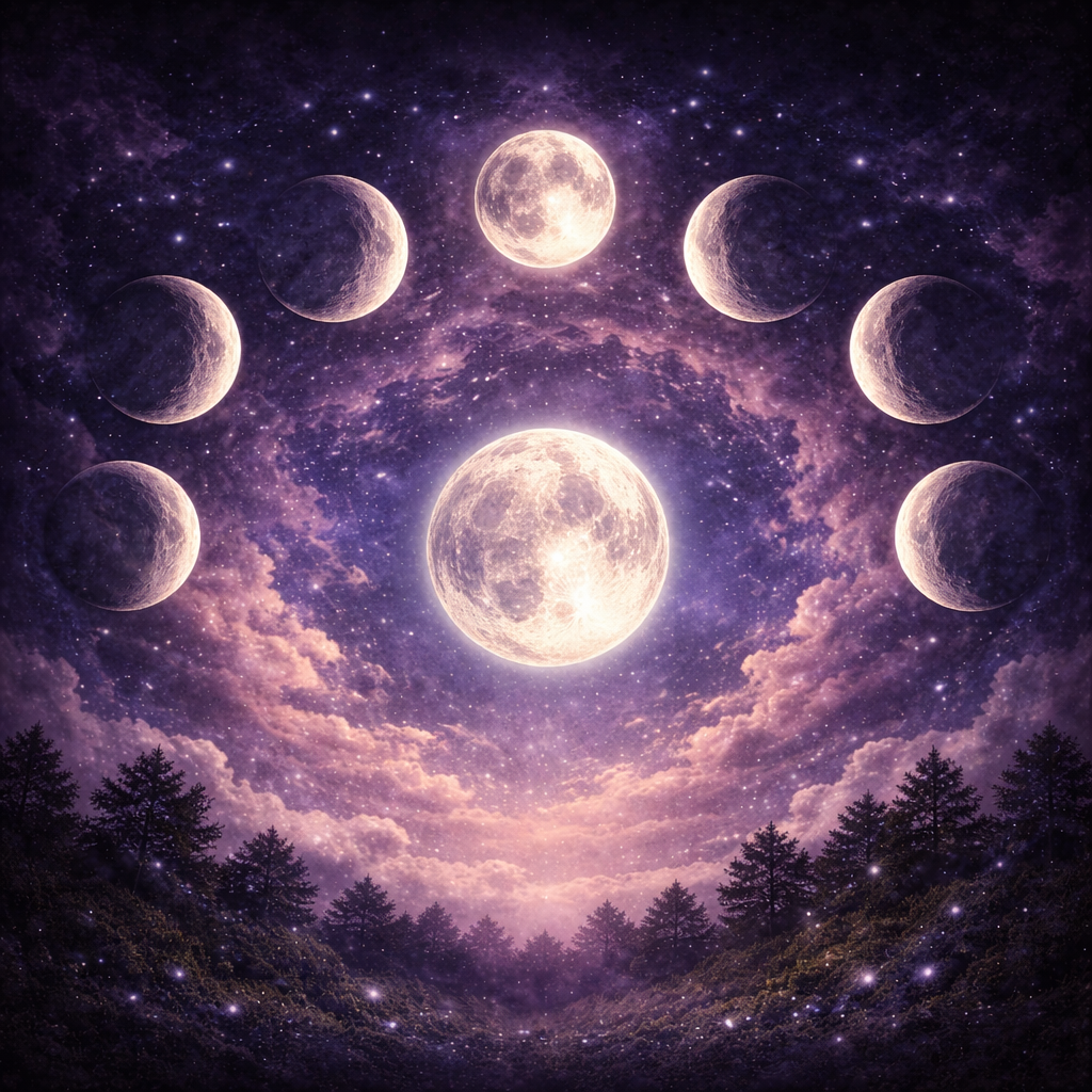 Tato část je věnována měsíční magii a proměnlivým energiím, které Měsíc přináší v úplňku i novoluní. Měsíc je od pradávna mocným průvodcem intuice, magie a rituálů. Když sledujeme jeho fáze, můžeme lépe porozumět vlastním cyklům, naladit se na přírodní rytmy a využít jeho sílu při osobním rozvoji i každodenním kouzlení.