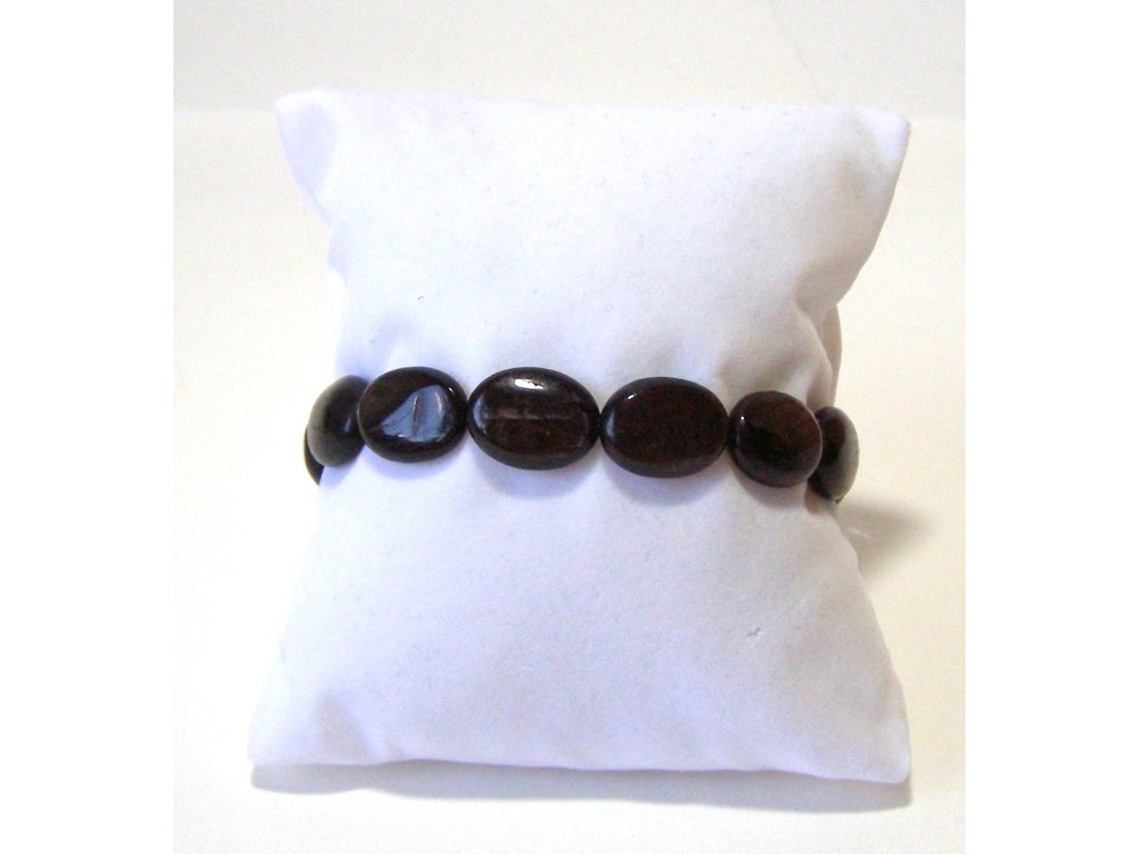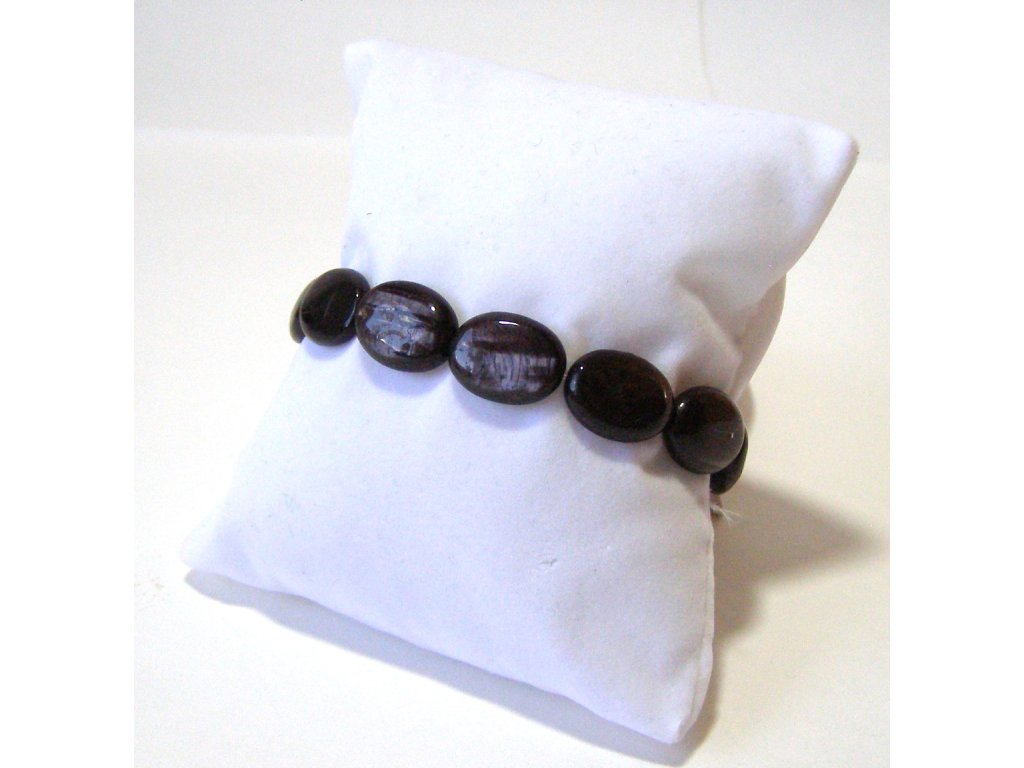 Náramek z hladkých oválků hyperstenu. Napínací, na gumičce. Pouze jeden kus, kupujete přesně ten, který vidíte na fotce.