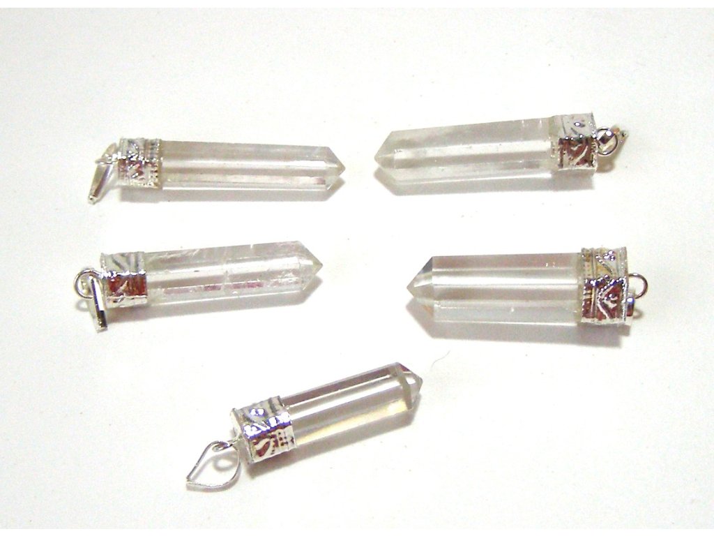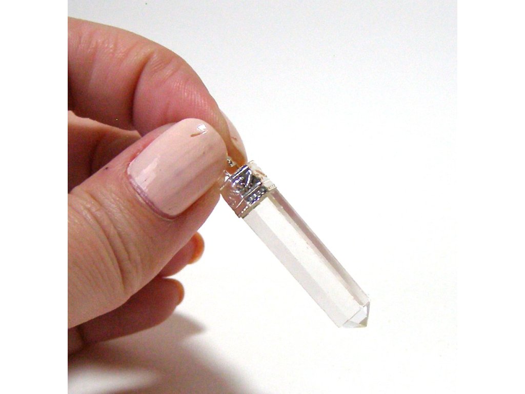 Přívěsek/kyvadlo z křišťálu s bižuterním úchytem. Jedná se přírodní kámen, zabarvení jednotlivých kusů se může lehce lišit.