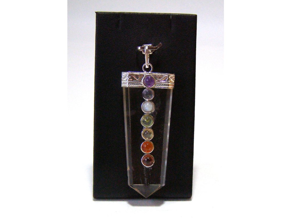 Nádherný přívěsek z křišťálu v bižuterním kovu se 7 čakrovými kameny. Jedná se o přírodní materiál, zabarvení jednotlivých kusů se může lehce lišit.