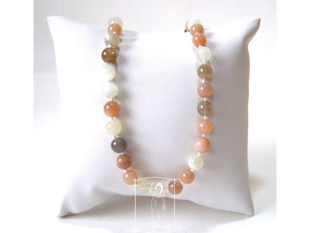 Náhrdelník je tvořen hladkými kuličkami měsíčního kamene se zapínáním z chromovaného obecného kovu.