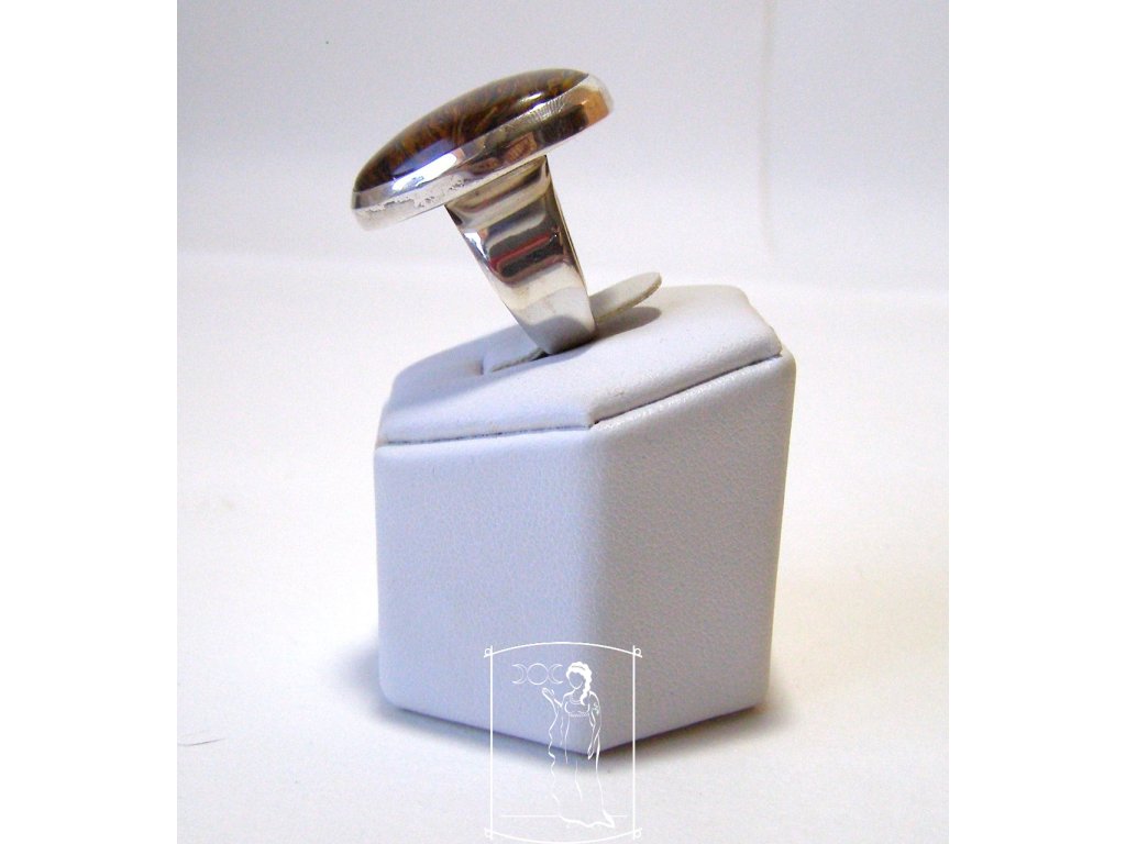 Prsten Světlo v bouři má oválný kámen, který na ruce působí přirozeně a přitom je výrazný. V kameni se prolíná tmavší podklad s teplejšími hnědými až zlatavými liniemi a jemnými záblesky. Při každém pohybu ruky se kresba ukáže trochu jinak – a právě to dává pietersitu hloubku. Je to šperk, který není o okázalosti, ale o vnitřním bodu, ke kterému se dá vracet.